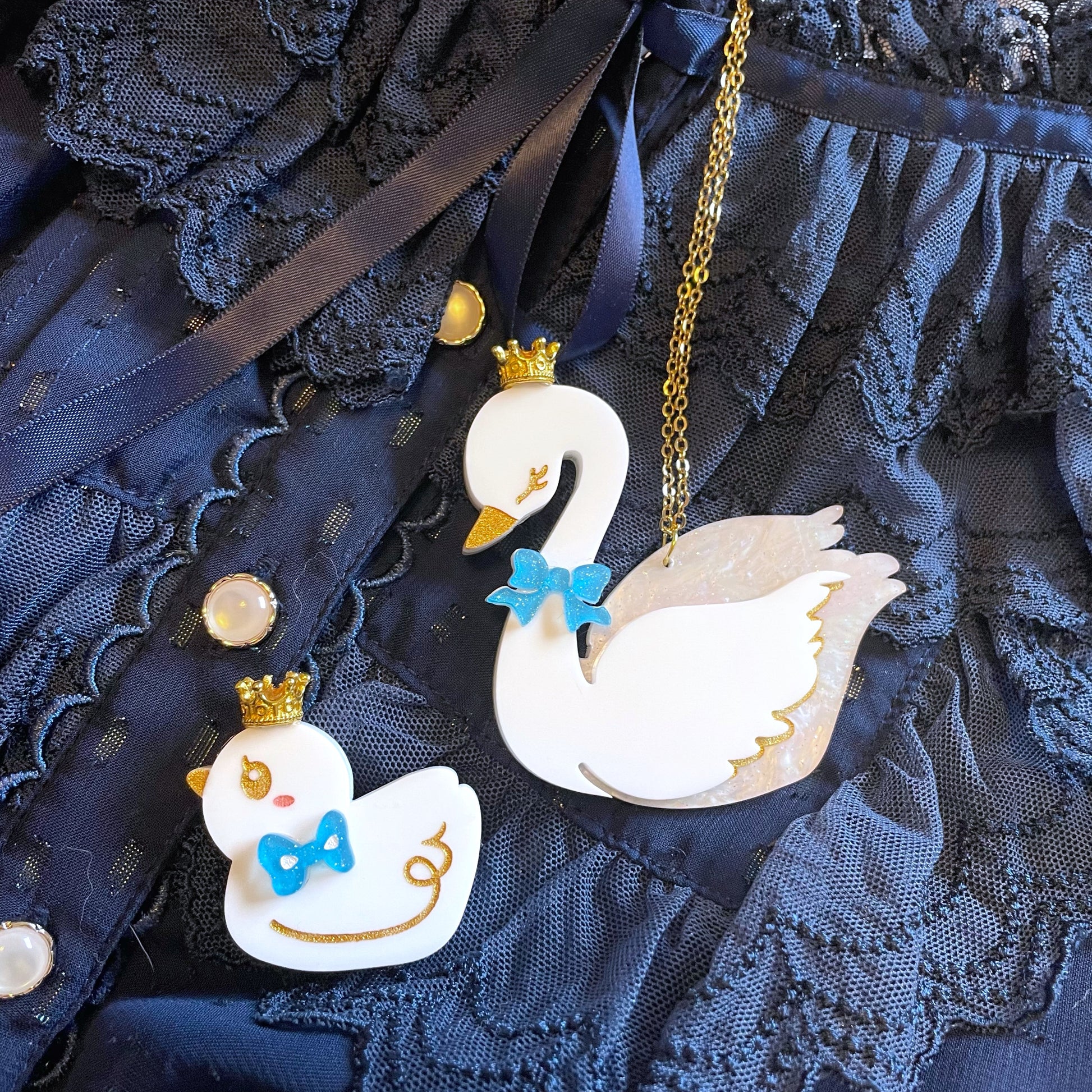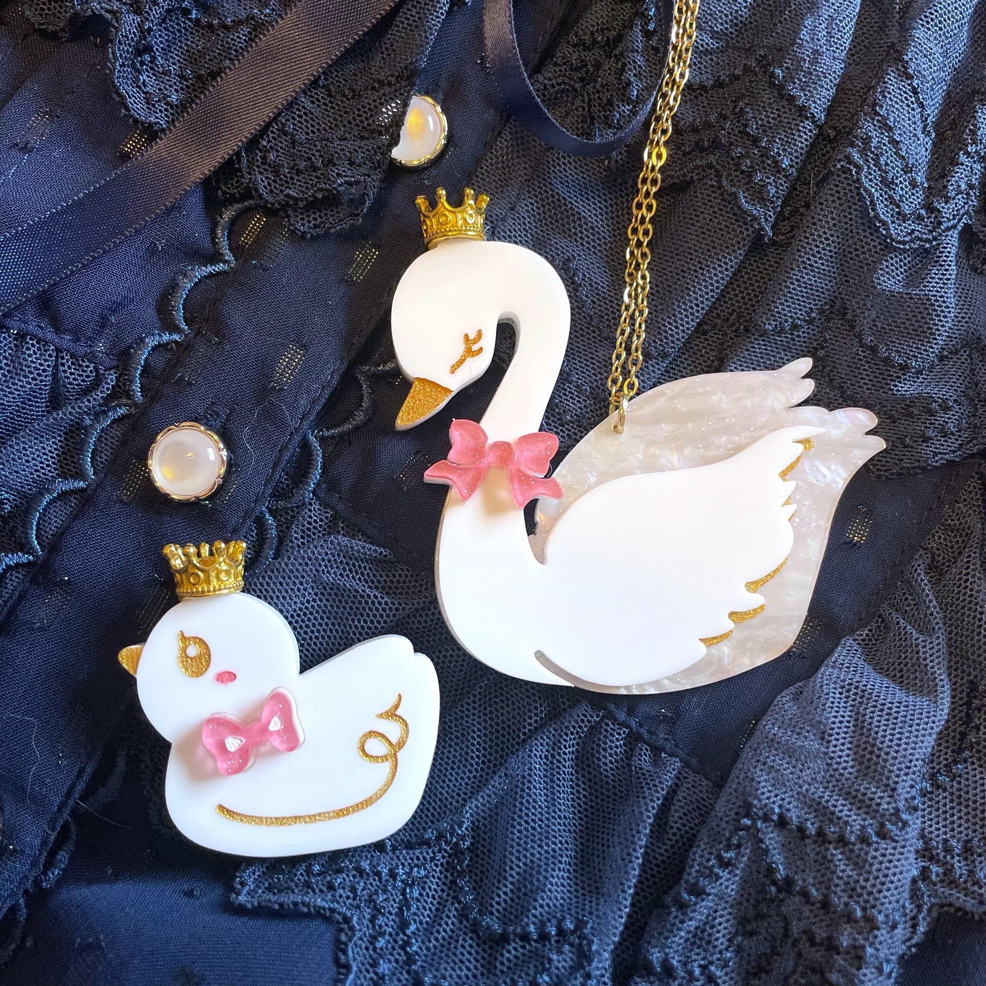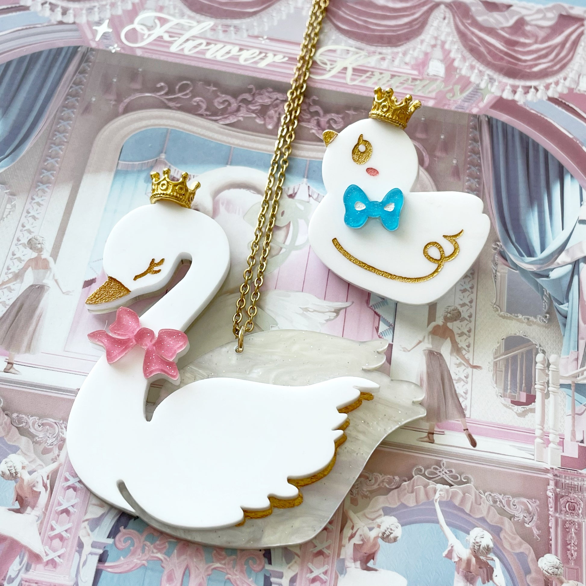 Acrylic cut Swan necklace and Cygnet pin, available with blue ribbon/pink ribbon